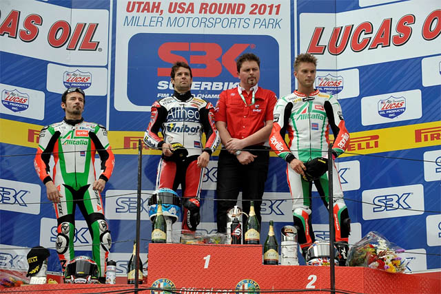 Nakon prve trke pored Checa-e na podijumu su se našli Smrz i Guintoli, takođe na Ducati-jima u potpunosti privatne Efenberg Liberty ekipe time potvrdivši dominaciju Italijanskog proizvođača. Nakon samo nekoliko krugova prve trke iz konkurencije su ispali Rea i Biaggi koji su bili upleteni u trkački incident nakon koga su pale međusobne optužbe koje će ostati ne razjašnjene pošto ni jedna kamera nije snimila šta se zaista desilo, slična situaciaj je zadesila i Fabrizio-a i Xaus-a, ali je tu sve bilo jasno kako zbog snimka tako i zbog priznanja krivice od strane Xaus-a.