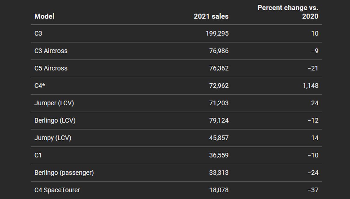 Najprodavaniji model prošle godine bio je mali hečbek C3, koji je na tržištu od 2016. godine, a zasnovan je na platformi prethodne generacije umesto one koju sada koriste uporedivi modeli iz Peugeota i Opela.