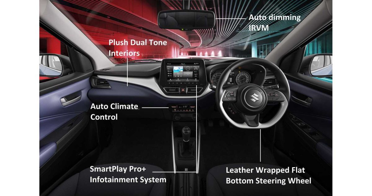 Kada je reč o enterijeru, novi Baleno ima devetoinčni ekran za multimedijalne sadržaje na vhu centralne konzole, a ventilacioni otvori su spušteni. Iako je reč o automobilu iz nižeg cenovnog ranga, opremljen je kamerom koja pokriva pun krug oko vozila. Suzuki je unapredio i sedišta, smanjio nivo buke, a putnici u zadnjem delu dobili su ventilacione otvore i USB priključke.