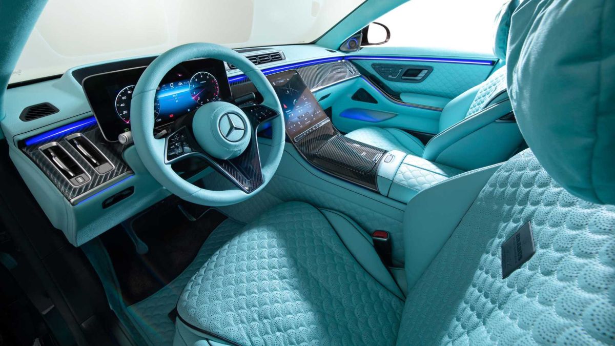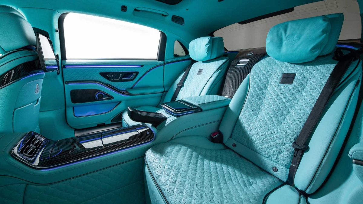 Brabus je presvukao kabinu najfinijom kožom sa završnom obradom tirkizne boje. Na ovaj način obrađeni su čak i tepisi i nebo, a svuda je maksimalno korišten karbon. Karbonske papučice su dobile gumene tačkice da ne bi bile klizave.