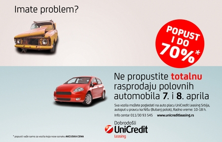 Tokom vikenda, 7. i 8. aprila, UniCredit Leasing Srbija organizuje totalnu rasprodaju polovnih vozila uz popuste čak i do 70%.