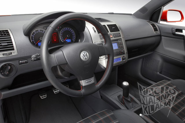 Enterijer u Polou takođe podseća na Golfov: specijalna sportska sedišta, sportski volan, kožom presvučena drška menjača i ručne kočnice, dok metalni detalji oivičavaju centralnu konzolu i ventilacione otvore sa strane. Sigurnost je takođe na visokom nivou – tu su prednji vazdušni jastuci, a suvozačev vazdušni jastuk se može deaktivirati.