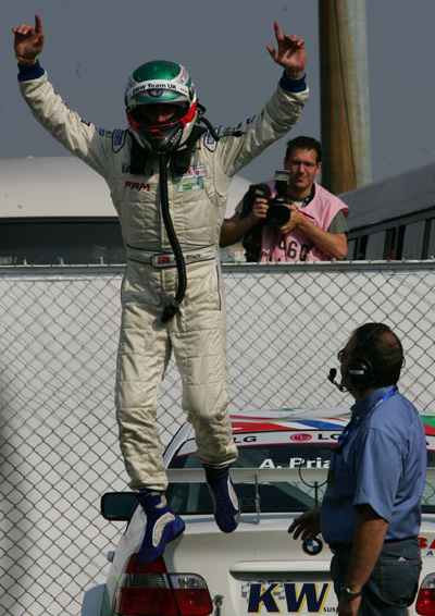 Već u sledećem krugu Priaulx gubi vodeću poziciju od strane Farfusa i ta borba za vodeću poziciju traje sve do samog finiša trke. Priaulx je vršio ozbiljan pritisak međutim Alfa je na dugačkim pravcima bila dovoljno brza da ne dozvoli BMWu obilazak, dok je na krivudavim delovima staze obilazak Frafusa bio praktično nemoguć obzirom da je mladi Brazilac odlično branio svoju poziciju. Za to vreme drugi kandidat za titulu, Dirk Muller, je bio na četvrtoj poziciji dok je Giovanardi koji je takođe pokušavao da obezbedi titulu kasnim kočenjem udario barijeru ka krivini 16. čime je Alfa Romeo ostala totalno demolirana. Giovanardi je uspeo da automobil nekako pomeri sa kritične pozicije iako je automobil bio bez prednjeg točka tako da nije bilo prekida trke niti “pejs kara”.