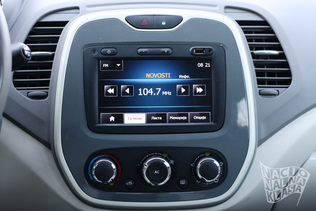 Ukoliko se odlučite na opcioni R-Link (690€) sistem kao što smo ga mi u test vozilu imali, centralnom konzolom će dominirati 7“ ekran osetljiv na dodir koji omogućava korišćenje svih sistema u vozilu, kao i upravljanje nekom od novih Renault aplikacija. U paketu stiže i navigacija sa mapama Evrope što znači da nemate mapu Srbije, već samo E70/E75 autoputeve. Ukoliko se odlučite za druge navigacione sisteme koje Renault opciono nudi (MediaNav, npr.) dobićete i kompletnu mapu naše države. U našoj zemlji LIVE mogućnosti R-Link sistema takođe neće biti dostupne, dok će sistem SMS poruke čitati na engleskom ili nekom drugom jeziku od 8 raspoloživih (srpski, naravno, nije dostupan).