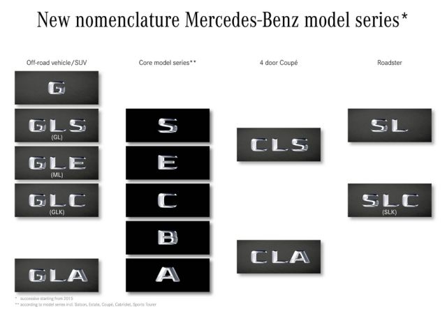 Mercedes-Benz je formalno objavio značajne izmene u davanju imena modelima iz svoje ponude. Nemačka kompanija izmenila je dosadašnji sistem kako bi više naglasila identitet pet ključnih serija: A, B, C, E i S klase. Zbog toga su preimenovana četiri važna modela i stvorene nove kategorije.