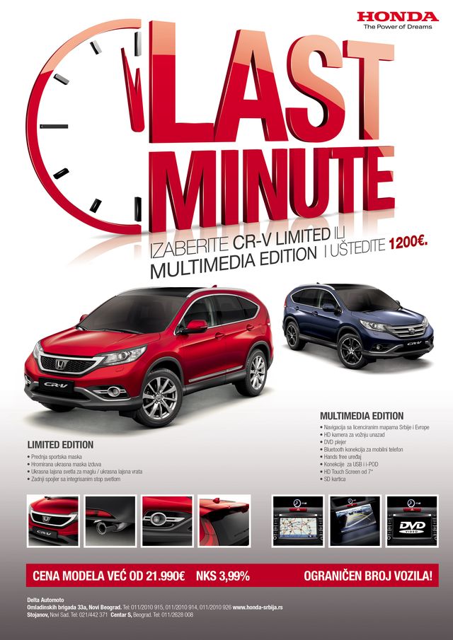 Dve specijalne serije Honda CR-V, Multimedia Edition i Limited Edition, modela se nude po promotivnim cenama i uz atraktivne uslove finansiranja.