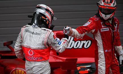 Vozači koji su 6 krugova kasnije otišli u boks odlučili su se da rizikuju sa gumama za suvo, iako su postojale najave prolazne kiše. Prvi je na gume za suvo prešao Webber, a zatim i Wurz. Oko 26. kruga ponovo je počela kraća kiša, a istovremeno i kulminacija trke. Već prilično istrošene gume na bolidu Hamiltona potpuno su popustile sa prvim kapima kiše usporivši Hamiltona za preko deset sekundi. Dok se Britanac žestoko borio da održi bolid na stazi Kimi je iskoristio priliku i potpuno se približio vodećem. Neminovno se desilo u krivini 8 u 28. krugu. Raikkonen koristi preširok ulazak Hamiltona i probija se na prvo mesto. Nakon preticanja Raikkoen je bez problema pobegao Hamiltonu ostavivši ga u problemima koji su bivali sve gori.