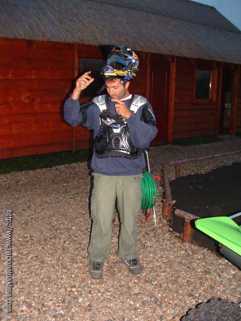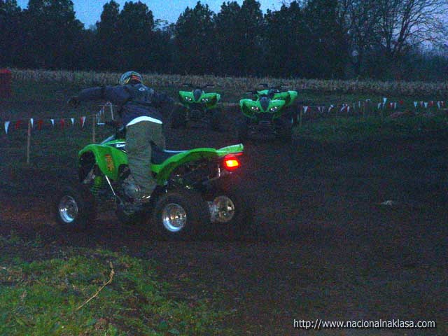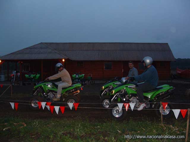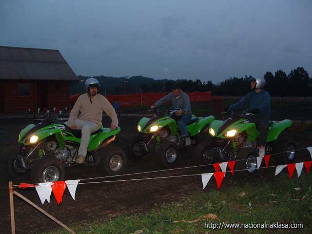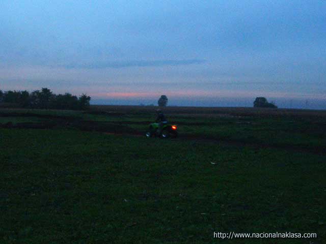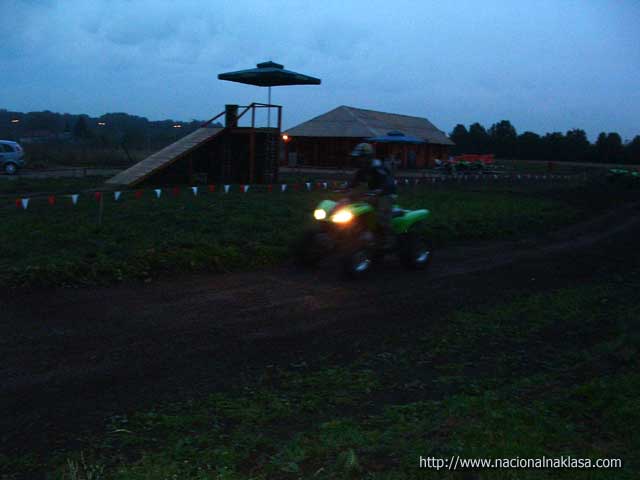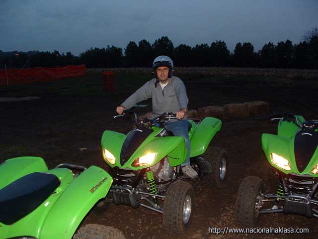 Vožnja je imala egzibicioni karakter obzirom da 47KS koji su na raspolaganju pri oštrijem dodavanju gasa imaju rezultat propinjanje (uraa!!) što dvostruko deluje na neiskusnog (dobra doza straha! i super osećaj da dodam još gasa!). Posle 7-8 minuta smo već počeli da hvatamo štos i da se naginjanjem i ofanzivnim skretanjem ubacujemo u krivinu, a da se dodavanjem gasa (i poigravanjem zadnjeg dela Quad-a) izvlačimo iz nje. Fantastično! Međutim, istovremeno je počeo i umor da se javlja, obzirom da za razliku od velike udobnosti koju pruža karting, sada shvatam zašto nema debelih motokros vozača. Ruke i noge su non-stop pod pritiskom i sinhornizacija pokreta svojstvena vozačima motorcikala je veoma bitna, a umor radi svoje te smo pored neiskustva u poslednjih krug, dva morali da se batrgamo nejakim ekstremitetima. Jasno, trud tj. snaga koji ulažu neiskusni vozači je daleko veći od onog potrebnog, ali je ovo svakako fizički veoma zahtevna vožnja. Imali smo veliku sreću da pored toga što smo vožnju započeli u sumrak pa smo morali da upalimo farove (u jeee, kao na Dakaru!!) i počela blago da pada što je dovelo do promene ponašanja quada u vožnji tj, slajdovi su bili duži i lakši za izvesti, ha! Posle 10 (mislim da je bilo i koji više) minuta vožnje kada smo konačno i stali na nesigurne noge, zamolili smo Darka da malo pokaže kako se to radi pravilno (filmići će biti postavljeni za dan-dva). Kako nam je rekao, BMX staza je u pripremi, a biće još zanimacija za ekstremne sportiste o čemu detaljnije možete da pročitate na samom sajtu kluba.