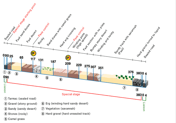 Putevi kojima se specijalni ispit kreće su napravljeni od prirodnih materijala, tačnije to su putevi koji nemaju jasno definisane ivice, imaju veliki broj “kolotečina”, a određeni delovi ispita se ne mogu nazvati putem, a tu se uključuju i prelasci preko dina. Iako su to utabani putevi, oni su ipak samo lokalni putevi koje su lokalni žitelji utabali tokom godina i variraju od šljake i šljunka pa do puteva koji se kreću po kamenoj podlozi ili potpuno peščanih puteva. Termin “pustinja” se najčešće koristi kada se misli na pesak, ali materijal po kome se vozi može biti veoma promenljiv do te mere da se ne pojedinim deonicama nailazi na veoma tvrdu podlogu po kojoj se može voziti bez velikih problema i postizati veoma velike brzine. Naravno, tu su i ogromna prostranstva pokrivena peskom koji može biti veoma mekan, a možete naići na tzv. “suve reke” (Suve reke su praktično suva korita reka koja teku kroz pustinju. Te reke postoje samo u kratkom vremenskom periodu posle velikih pustinjskih oluja koje povremeno mogu da se pretvore u pravo nevreme sa velikom količinom kiše). Prelazak dina može biti različite težine u zavisnosti sa koje strane dine se prilazi zato što ih vetar formira tako da su one nezgodne ukoliko se nailazi sa strane sa koje duva vetar i time se nailazi na oštar i u tom trenutku nevidljivi deo dine. U Mauritanija gde ima jako malo kiše rasprostranjena je “kamilja trava” koja može svojim korenom da poveže pesak i tako izdrži i teška vozila tako da uprkos mekanom pesku automobil poskakuje i time dovodi amortizere do pregrevanja. U drugom slučaju neke podloge prave praktično finu peščanu zavesu koja onemogućava brzu vožnju pa tako vozila imaju ogromne probleme da preteknu drugo vozilo, a u zavisnosti od vetra vidljivost se može biti umanjena i od sopstvene prašine. Učesnici se često susreću sa velikim opasnostima i čestim sudarima u ovakvim okolnostima gde je vidljivost umanjena, pa su drugi učesnici ili prirodne prepreke maskirane.