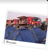 Bivak je mesto gde se nalazi reli centar, medicinski i medijski objekti kao i lokacija na kojoj se hrana za učesnike izdaje (stariji učesnici Dakara ovo mesto zovu Afrička Tura – “African Tour” po natizivu firme koja je ranije obezbeđivala hranu). Vozila se tokom noći ne zaključavaju i tokom noći je moguće vršiti popravku. Te popravke mogu izvršavati takmičari, mehaničari i članoci tima koji su registrovani za te operacije. Do pre nekoliko godina, mahaničari i članovi tima su prevoženi avionima koje je obezbeđivao organizator, ali je borj tih letova vremenom umanjivan svak godine tako da je sada ostao samo jedan let dnevno pa se mehaničari prevoze u vozilima za servis i podršku. Ovo je dodatni element trke koji dodatno unosi duh ovog takmičenja ne samo takmičarima već svim pratećim ekipama koje putuju zajedno sa takmičarima, međutim kako bi se sprečilo mešanje pratećih ekipa tokom etape, takmičari mogu da koriste samo one rezervne delove koje nose sa sobom.