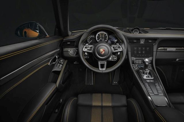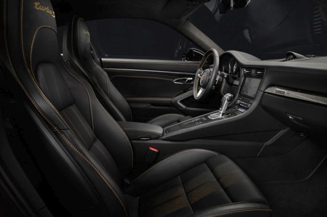 U kabini su Porscheova sportska sedišta sa oznakom Plus deo standardnog paketa i presvučena sa dva sloja kože u zlatnom dezenu, u skladu sa izgledom karoserije. Tu su i kontrastni šavovi i alkantara na unutrašnjoj oblozi krova, kao i elementi od karbonskih vlakana. Na suvozačevoj strani kabine nalazi se pločica sa serijskim brojem automobila, a pragovi su u visini ukrašeni karbonom i imaju oznaku Exclusive Series.