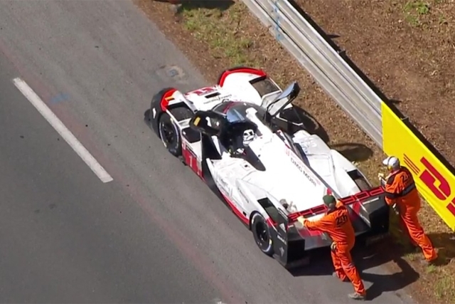 Nakon silnih problema Tojote oko ponoći i #2 Poršea još u prvoj trećini trke, delovalo je kao da će #1 posada Poršea doći do još jedne pobede, ali do toga ipak nije došlo. Loterer je bio za volanom Poršea #1 u trenutku kada je prijavio problem sa pritiskom ulja u sistemu. Sporim tempom bez primarnog pogona je pokušao da se dovuče do boksa, međutim epilog je bio isti kao i kod Tojote #7 sinoć. Ostali su parkirani na pravcu i uz silne pokušaje restartovanja sistema, od buđenja te mašine nije bilo ništa. U trenutku odustajanja Loterer je imao 13 krugova prednosi u odnosu na LMP2 #38 mašinu, a ubrzo posle par pokušaja da se ponovo pokrene taj Porše Loterer je dobio instrukciju da ugasi sistem i odustane. Tako Loterer nije uspeo da upiše pobedu i sa Poršeom, obzirom da već ima pobedu sa Audijem. Tada je postalo jasno zašto Porše nije digao ruke od posade #2 koja se dala u poteru za LMP2 mašinama kako bi izbili na čelo u generalnom plasmanu.