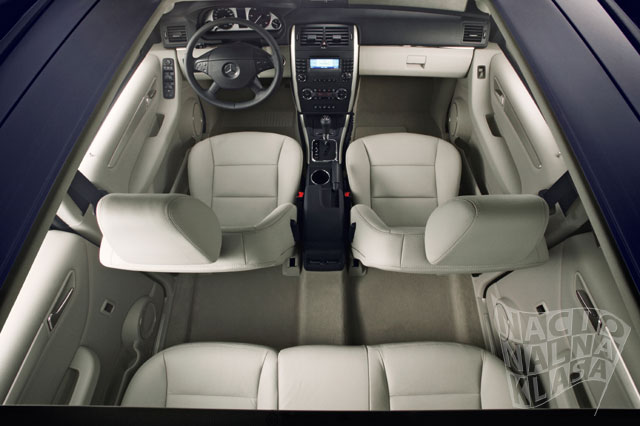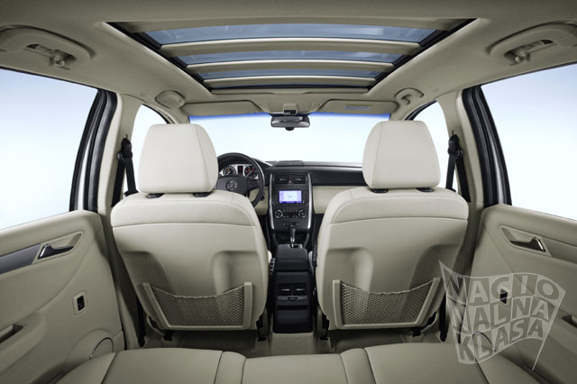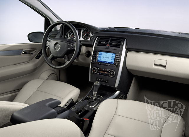Oprema i sigurnostVeoma kvalitetni metrijali i dosta standardne opreme Dizajn interijera i eksterijera zajedno formiraju veoma komfornu u luksuznu atmosferu čime se omogućavaju veoma lagodna dugačka putovanja. Standardna oprema obuhvata klima uređaj, multifunkcionalni volan sa četiri paoka, odmorišta za ruke kod prednjih sedišta, elektro podizače stakala i veoma kvalitetni aluminijumske detalje na centralnoj kontzoli, bregu i vratima. Visoka tehnologija od bi-xenona do THERMOTRONICa Najmoderniji sistemi iz Mercedesovih luksuznih automobila su preneti u B klasu kako bi povećali komfor. Opciono je moguće ugraditi THERMOTRONIC automatski klima uređaj, elektropodesiva prednja sedišta, kožni interijer kao i COMMAND APS ili Audio 50 APS radio/navigacione sisteme. Na zahtev se standardni farovi mogu bi-xenon i ALS sistemom zakretanja farova u pravcu vožnje. Novorazvijeni panoramski stakleni krov omogućava putnicima B klase fanatstičan ugođaj otovorenog prostora. Novi stakleni krov je 60% lakši od standardnog pomičnog staklenog krova, dok je moguće kao drugu opciju imati fiksirani panorama stakleni fotogrej krov. Mercedes-Benz B Klasa u prodaju ulazi na leto 2005.