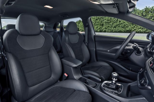 Standardna kabina i30 u N verziji je pojačana sportskim elementima poput sportskog upravljača sa dodatnim tasterima, novom ručicom menjača i sportskim sedištima. Kontrastni plavi šavovi nalaze se svuda po kabini. Integracija Apple i Android uređaja je deo standardnog paketa u kombinaciji sa ekranom dijagonale pet inča, dok je veći ekran od osam inča na listi dodatne opreme.