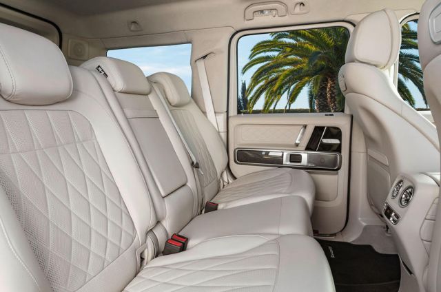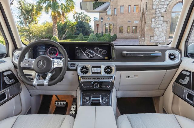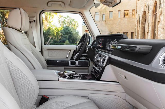 U raskošno opremljenoj kabini sada ima 150mm mesta više u predelu nogu u poređenju sa starim modelom, a širina je povećana za 20mm. G63 je dobio Mercedeseov kokpit čiji standardni analogni instrumenti mogu biti unapređeni digitalnim verzijama u kombinaciji sa multimedijalnim sistemom sa ekranom dijagonale 12,3 inča. Novi AMG dobio je redizajnirana prednja i zadnja sedišta, koja se mogu potpuno oboriti radi povećanja tovarnog prostora.