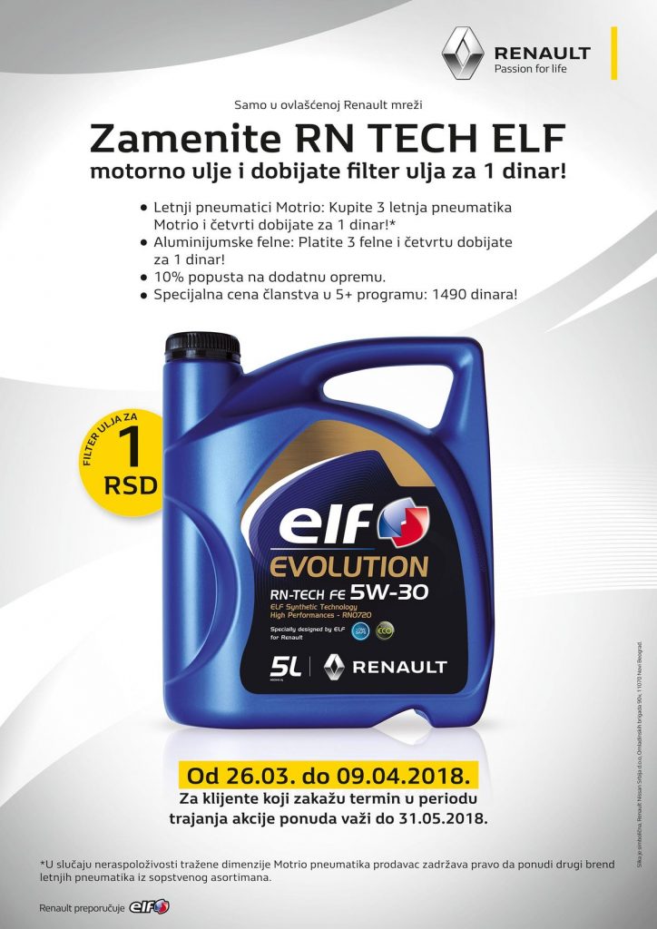 - Zamenite RN TECH ELF motorno ulje i dobijate filter ulja za samo 1 rsd