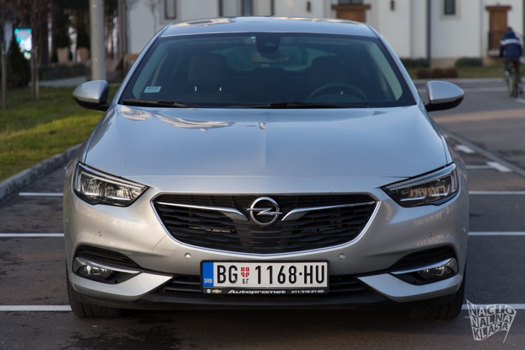 Sama šetnja oko automobila dodatno pojačava utisak veličine, jer ta šetnja može da potraje. Naročito ukoliko se zagledaju dizajnerski detalji. Prednji deo i maska kod originalnog modela su bili nekako previše „okrugli“ za moderne „oštre“ standarde, sa možda i previše hrom elemenata. Kod novog modela su momenti nešto diskretniji i sada imamo samo jednu hromiranu liniju oko Opel znaka. Pored lepšeg izgleda, ovakav pristup dodatn ističe znak marke, a bez potrebe da se isti poveća na gigantske dimenzije što je sad postao maltene industrijski trend. Prisustvo više uglova na masci se uklapa u dizajn farova (Matrix Lux LED) i donjeg dela branika, čime se kompletira agresivno elegantan izgled prednjeg dela.