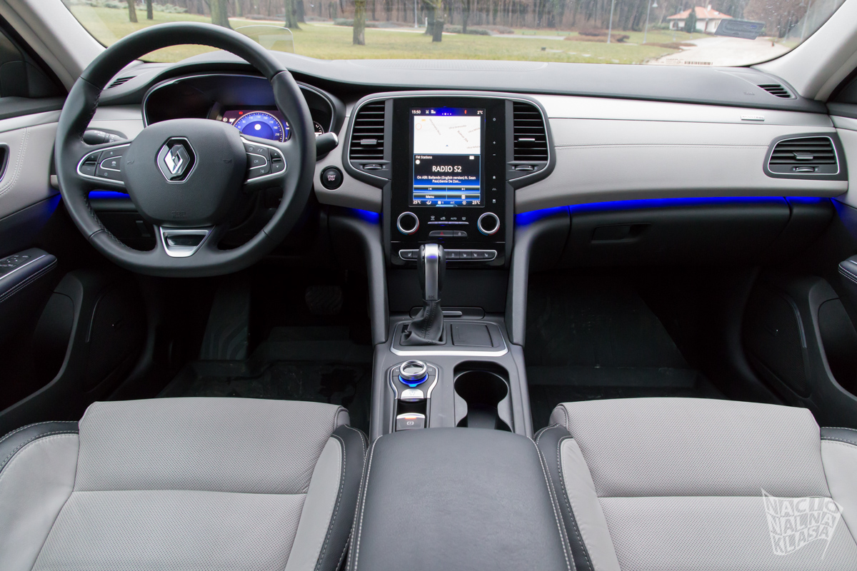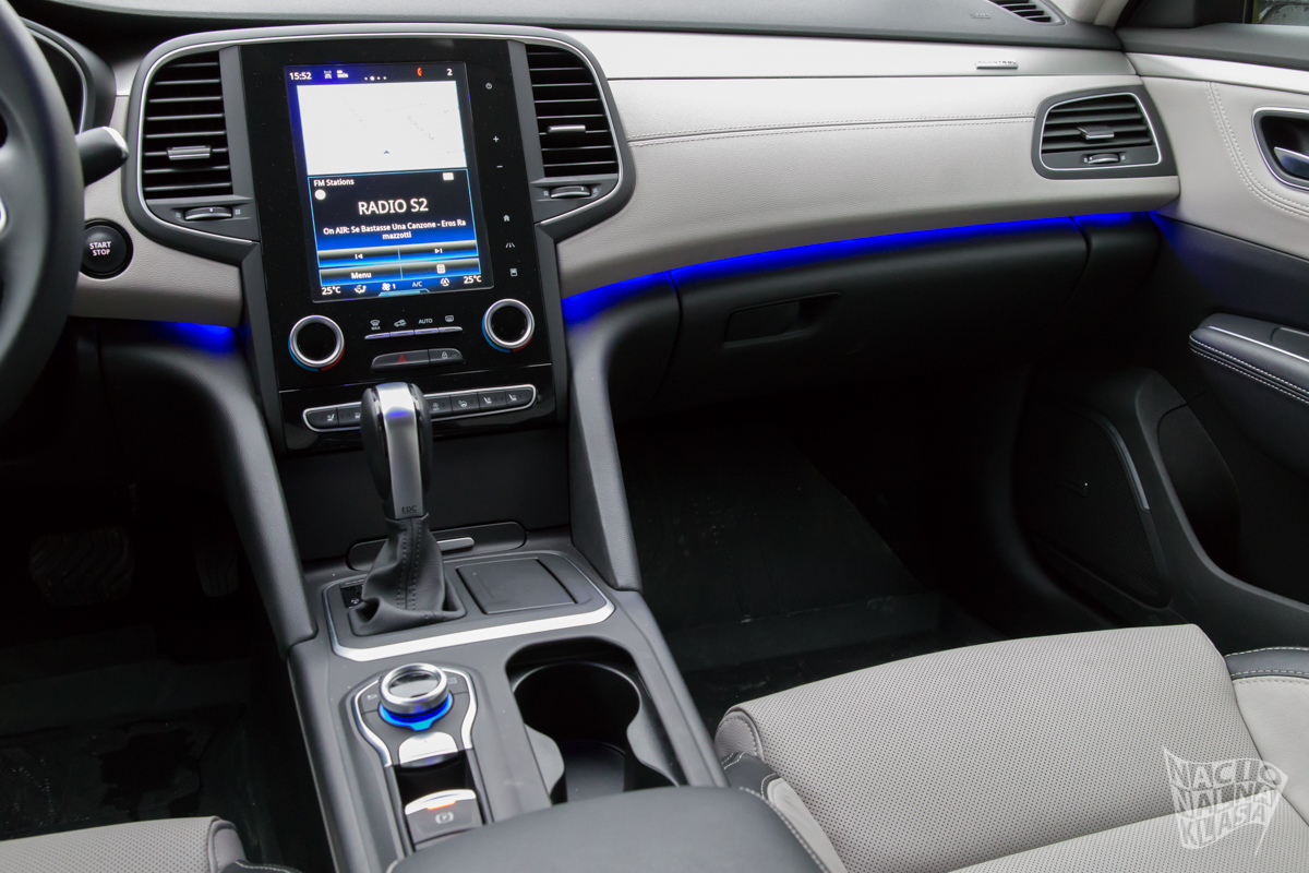 Sa kompletno novom Renoovom gamom i R-Link2 sitemom smo se susretali više puta pa tako i ovde imamo iste zamerke kada je ovaj sistem u pitanju. Pozitivno je to što se u Talismanu dobija navigacioni taster kod menjača pa se kroz menije možete kretati i bez upotrebe ekrana, barem donekle, ali to rešenje nije baš najsretnije sprovedeno tako da će se ipak više koristiti ekran osetljiv na dodir. Takođe središnja konzola deluje prilično minimalistički dizajnirana sa 8,7“ ekranom na sredini uz prilično mali broj analognih tastera. Ovo rešenje je prilično futurističko i liči na nešto što bi se moglo naći u nečemu daleko ekskluzivinijem, poput Tesle.
