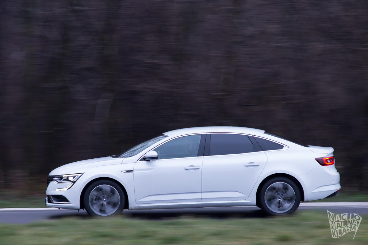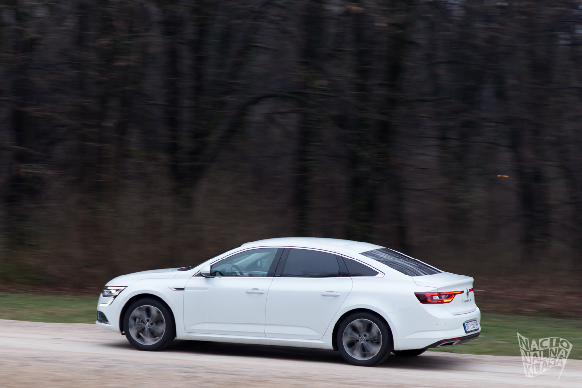 Relativno niska silueta i 4849mm ukupne dužine su lepo ukomponovane pa automobil deluje skladno i dobro odmeren. Zadnji kraj sa relativno kratkim poklopcem prtljažnika definiše tu sportsku siluetu koji Talisman ima gledajući ga sa strane, a kada se tome dodaju masivni 18“ točkovi priča postaje još jasnija. Interesantno je to što srednji deo automobila (onaj od A stuba do C stuba) deluje masivno, dok prednji i zadnji kraj deluju prilično sportski nastrojeni, ovde su dizajneri Renoa udradili vrlo lep posao. Subjektvno je da li vam će se ovo dopasti ili ne, ali činjenica je da je Talisman vrlo skladno dizajniran.