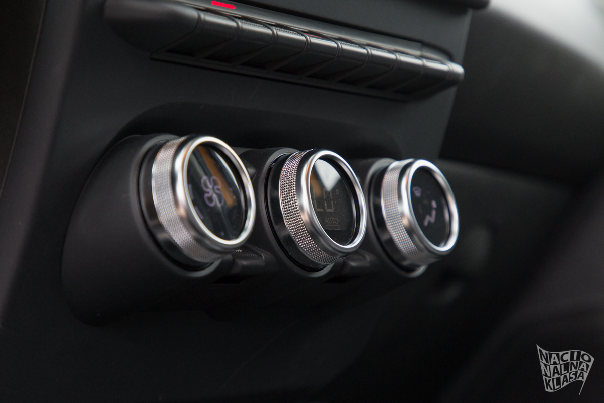 Kontrole klima uređaja su potpuno nove i one su, verovatno, najupadljiviji element enterijera. Dizajn, ali i kvalitet izrade su sjajni i apsolutno neviđeni u ovoj cenovnoj klasi vozila. Iskreni da budemo, čak ni mnogo skuplji automobili ne mogu da se pohvale ovako dobro urađenim kontrolama klima uređaja, a da pri tome ne uzimamo u obzir koliko su specijalizovane kontrole klime postale velika ekskluziva s obzirom da novi automobili sada mahom traže beskonačno pipkanje po nekom od ekrana u pokušaju da bilo šta smisleno uradite u vozilu. Ručica menjača je, poput komandi klima uređaja, izrađena sa nalik-aluminijumskim prstenom koji i ovu komandu čini vrlo taktilnom i sjajnom za dodir.