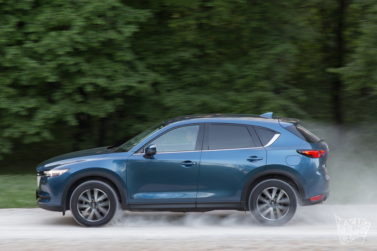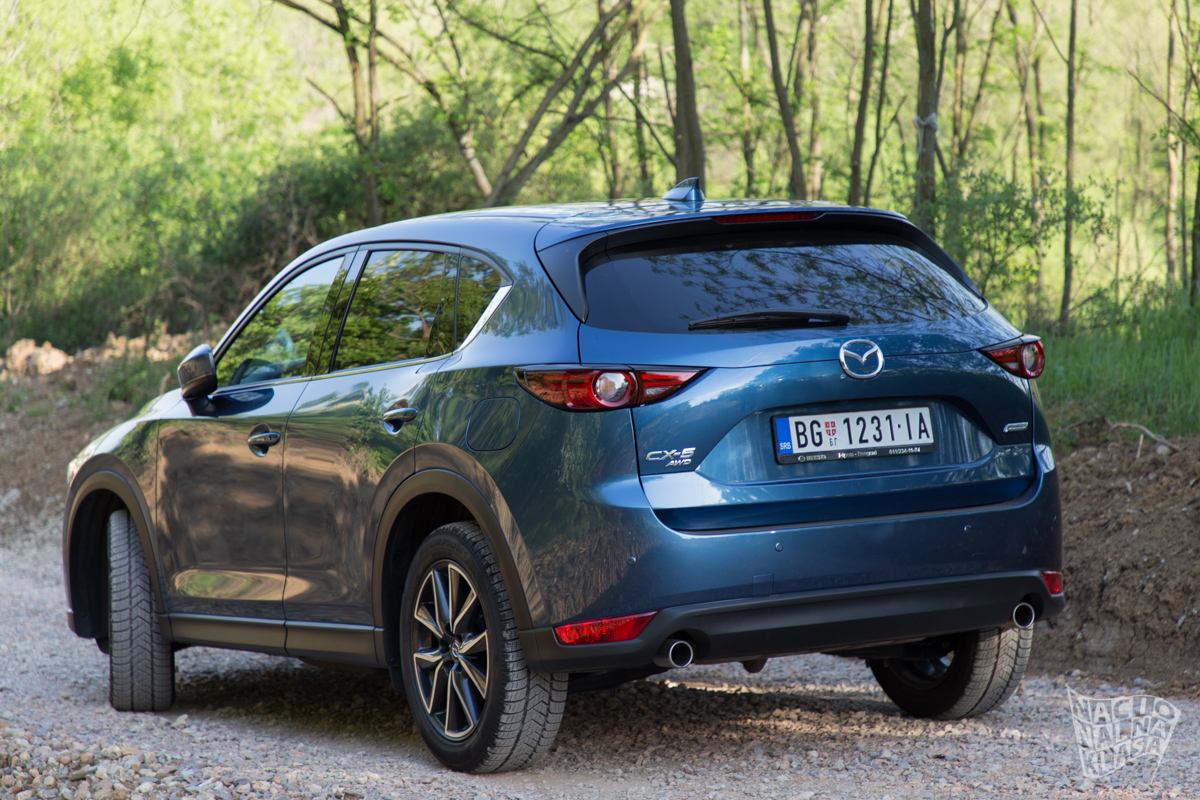 Naši testovi ne uključuju terenske sposobnosti, bar ne u smislu da tražimo limite pogonskog sistema i šasije. Standardna vožnja makadamom ili kolskim putevima sa mestimičnim lokvama nisu posebna prepreka za CX-5 pogonski sistem i u realnosti su daleko veća opasnost po 19” felne i karoseriju koja je bila u posebnoj plavoj boji specifičnoj za novi CX-5 modela.