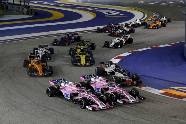 Hamilton je dobro startovao sa pol pozicije što je njemu bilo od velikog značaja kako bi izbegao neki duel u prve dve krivine na ulicama Singapura koje su prilično komplikovane kada je gužva na stazi. Fetel je takođe dobro krenuo i napao je Verštapena, ali ga je voač Red Bula odbio i sačuvao je drugo mesto na izlasku iz prvog spleta krivina, ipak Fetel je iskoristio bolji izlazak iz naredne krivine i pretekao je Verštapena pre aktiviranja sigurnosnog automobila. Razlog za izlazak sigurnosnog automobila bio je udes Okona i Pereza, gde je Okon ostao na stazi sa polomljenim prednjim vešanjem jer ga je klupski kolega praktično odbacio u zid na izlasku iz krivine. Iz Fors Indije se nakon trke pojavilo i objašnjenje da su strogo zabranili svojim vozačima da se do kraja sezone utrkuju između sebe!