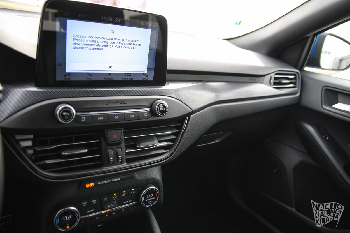 Focus će se isporučivati sa širokim spektrom sigurnosne elektronike, koja nudi sve pomoći koje vozači očekuju od modernih vozila – nadzor slepog ugla, aktivni tempomat, automatsko kočenje, nadzor kolovozne trake i ostale sisteme uključujući i neke vrlo zanimljive kao što je detekcija rupa na asfaltu!? Ovaj sistem će u našim uslovima raditi prekovremeno i sa velikim zanimanjem očekujemo da ga isprobamo u na našim drumovima. Novost je prisustvo HUD sistema (prikaz servisnih informacija na ekranu ispred vetrobrana), a na spisku opcija se nalaze i sve popularniji bežični punjač mobilnog telefona. Centralni ekran je 4,2“ u serijskoj opremi, dok se na spisku opcija nalazi 6,5“ i 8“ ekran.