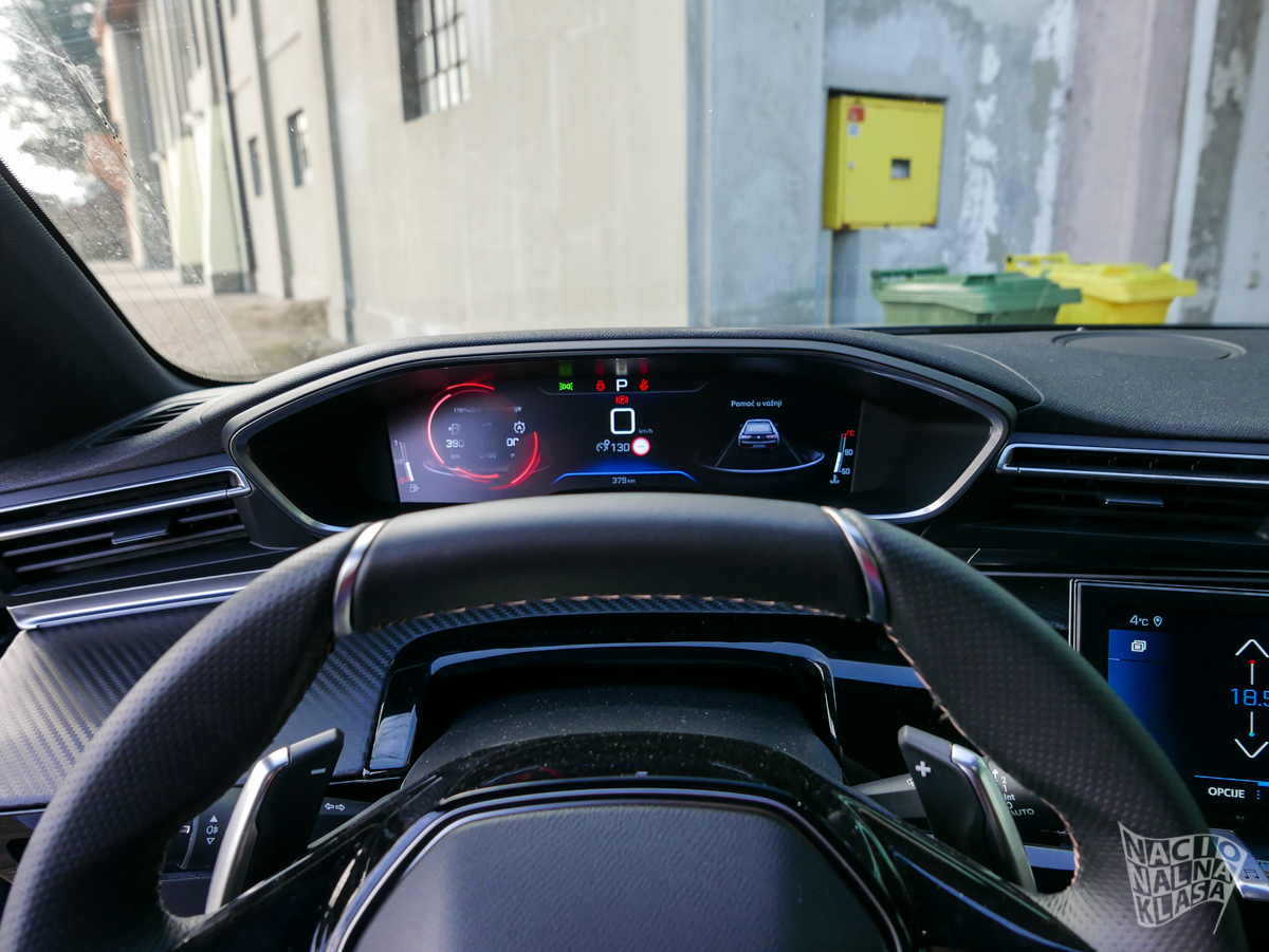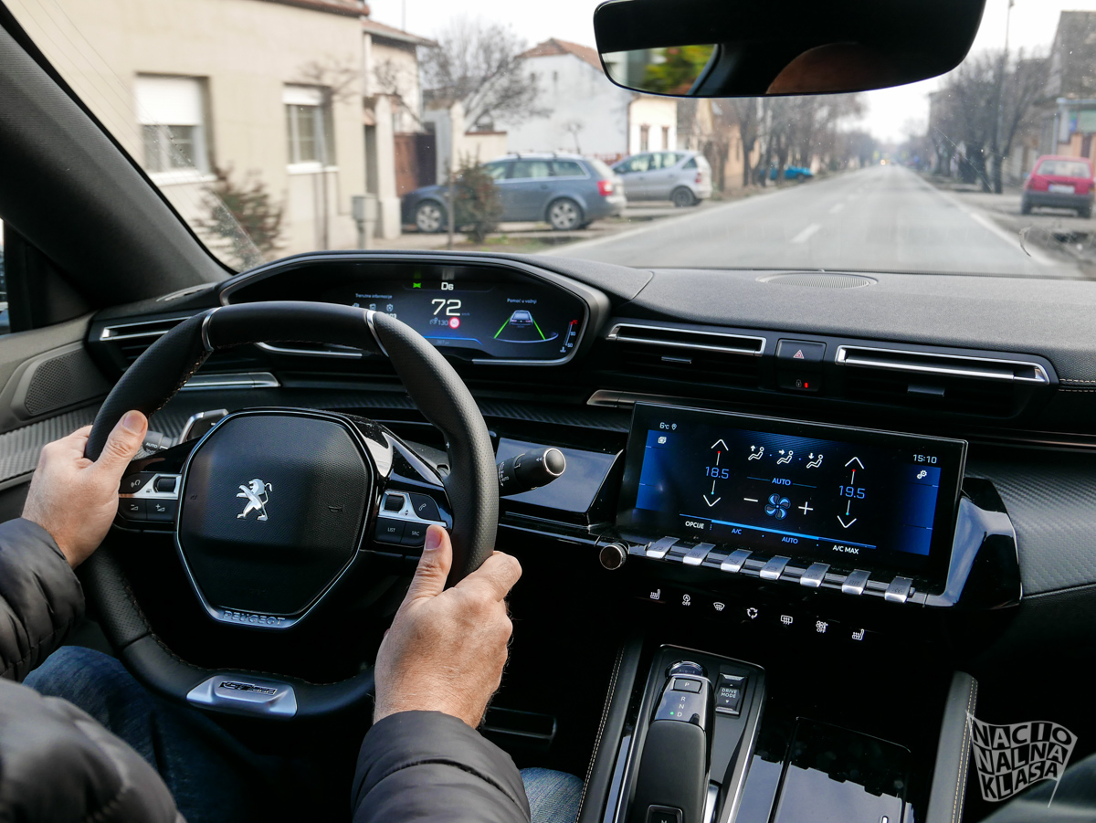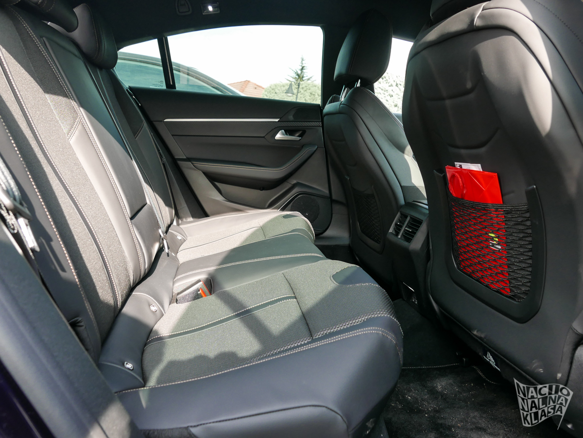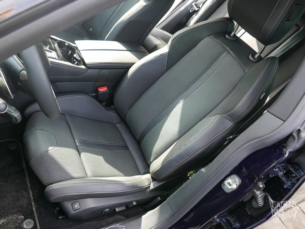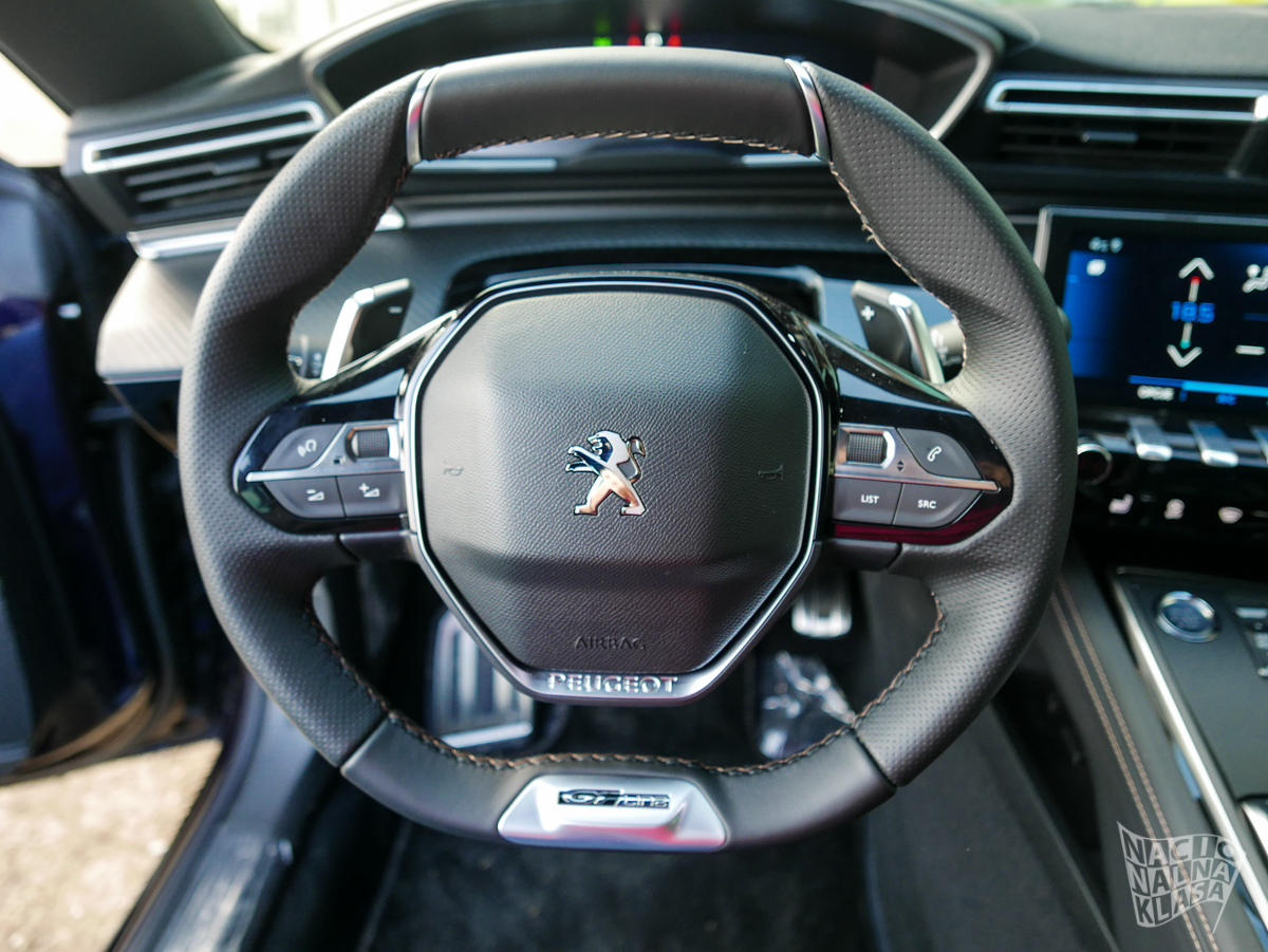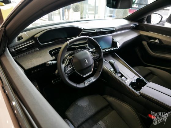 Enterijer je, u skladu sa samim izgledom karoserije, daleko sportskiji čemu doprinosi pomalo neobična ergonomska teza koju zastupa Pežo gde vam je volan praktično u krilu, a komandna tabla i druga generacija iCockpit 10“ sistema praktično u direktnoj vidnoj liniji. Sedišta su izuzetno udobna, dok AGR sertifikat (koji je jasna veza sa kupovinom kompanije Opel) garantuje da su sedišta i potpuno ergonomska. Na spisku opcione opreme se nalazi i zvučni sistem francuske kompanije Focal, bežično punjenje telefona i električno otvaranje prtljažnika.