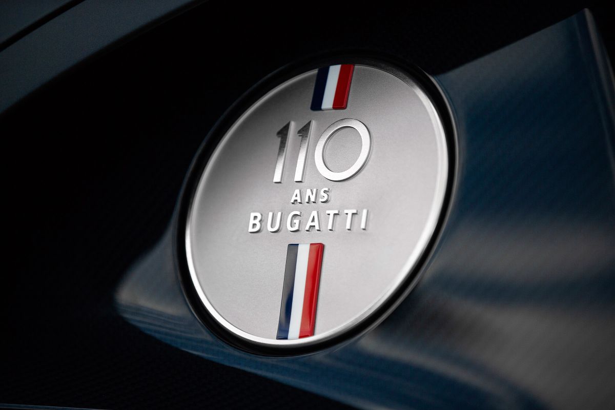 Mat finiš se proteže i na izložene karbonske elemente na prednjem kraju, a aluminijumske felne su u mat crnoj boji sa upisanim logom “110 ans Bugatti” na centralnom šrafu. Zadnji difuzor i branik su u čelično plavom karbonskom dezenu, a izduvni sistem je u kontrastnoj crnoj boji.