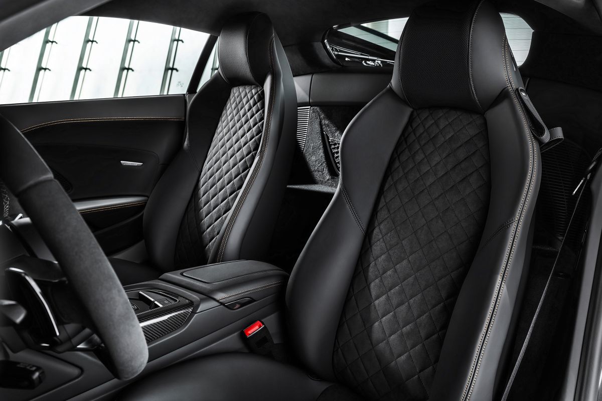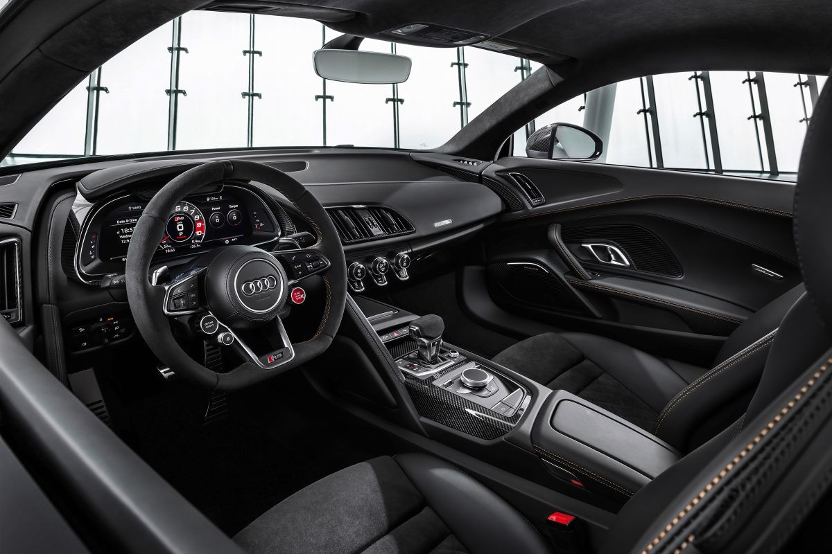 Specijalni R8 u kabini je dobio par sportskih sedišta za kilt dezenom, alkantarom presvučeni upravljač, šavove u boji bronze, karbonski trim, novi selektor brzina, digitalnu instrument tablu sa integrisanom satelitskom navigacijom i kameru za pogled unazad. Dodatna oprema obuhvata “laserska” LED prednja svetla, Bang & Olufsen audio sistem i adaptivno ogibljenje.