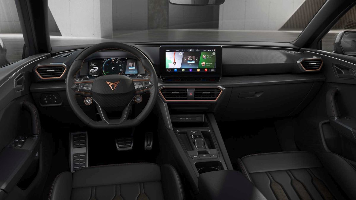 Bronzana tema nastavlja se u kabini, sa akcentom na šavovima sedišta, ivicama ventilacionih otvora i upravljaču. Na njemu se nalaze dva nova tastera: jedan je za pokretanje motora, a drugi za odabir režima vožnje (Comfort, Sport, Cupra ili Individual).