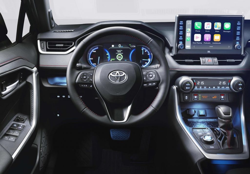 U kabini fokus je na novom dizajnu presvlaka, sa sportskim osećajem, rebrastim šarama s kontrastnim crvenim detaljima. Sedišta presvučena crnom kožom takođe su dostupna, s jarko crvenim trakastim detaljima. Centralna konzola poseduje multimedijalni displej dijagonale od devet inča, osetljiv na dodir – najveći u bilo kom RAV4 modelu – za jasnu i laku kontrolu funkcija za zabavu, informisanje i povezivanje.