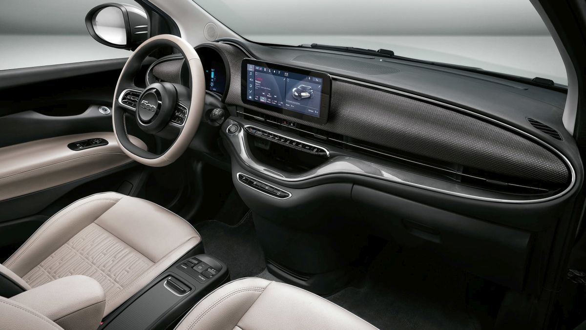 Kabina je unapređena kvalitetnijim materijalima, dizajn centralne konzole je čistiji, a 500e je prvi model iz FCA koji koristi novi uConnect 5 multimedijalni sistem. Funkcije se kotrolišu preko ekrana dijagonale 10,25 inča. Za sada je ugrađena tehnologija Apple CarPlay, a u budućnosti će postojati i podrška za bežični Android Auto.
